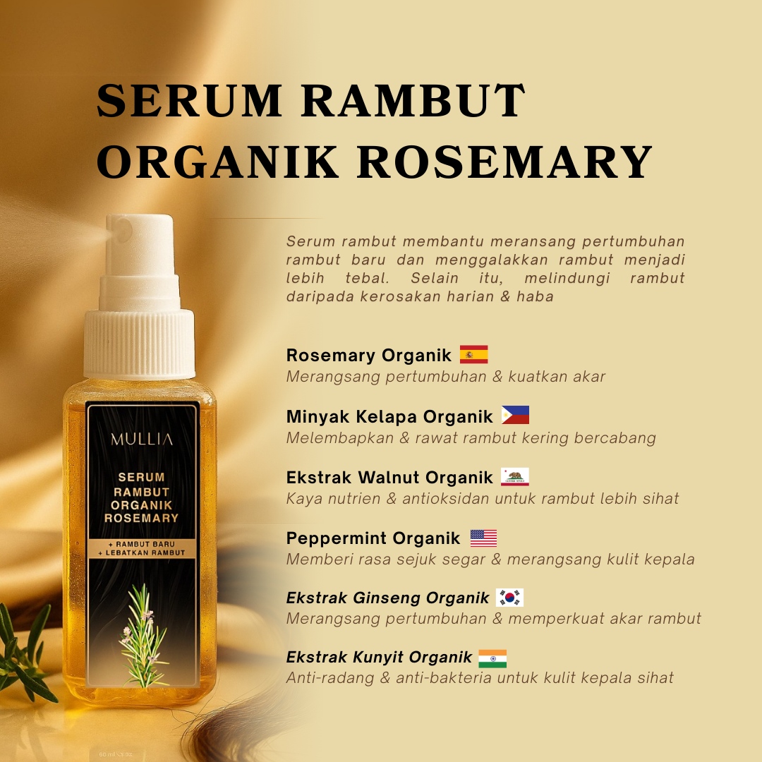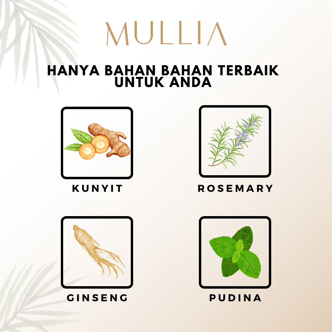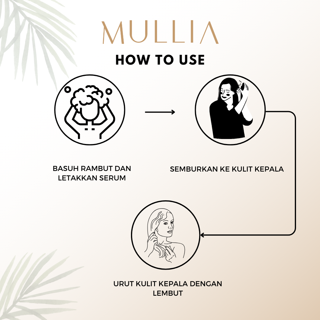 Meningkatkan Pertumbuhan Rambut: Serum rambut Mullia diperkaya dengan bahan organik yang bertindak menguatkan rambut, meransang bertumbuhan rambut baru dan menjadikan rambut lebih lembut.