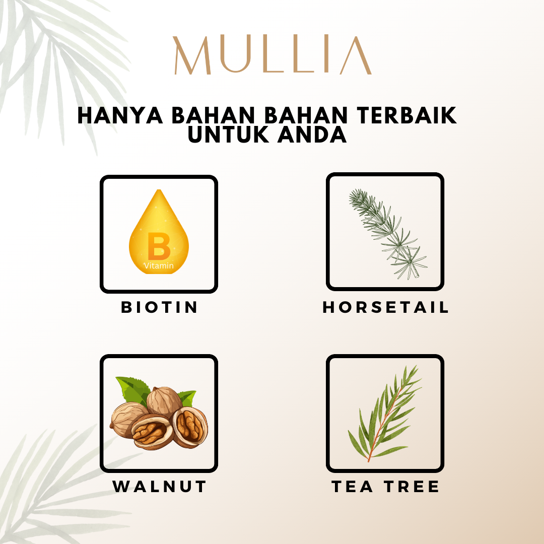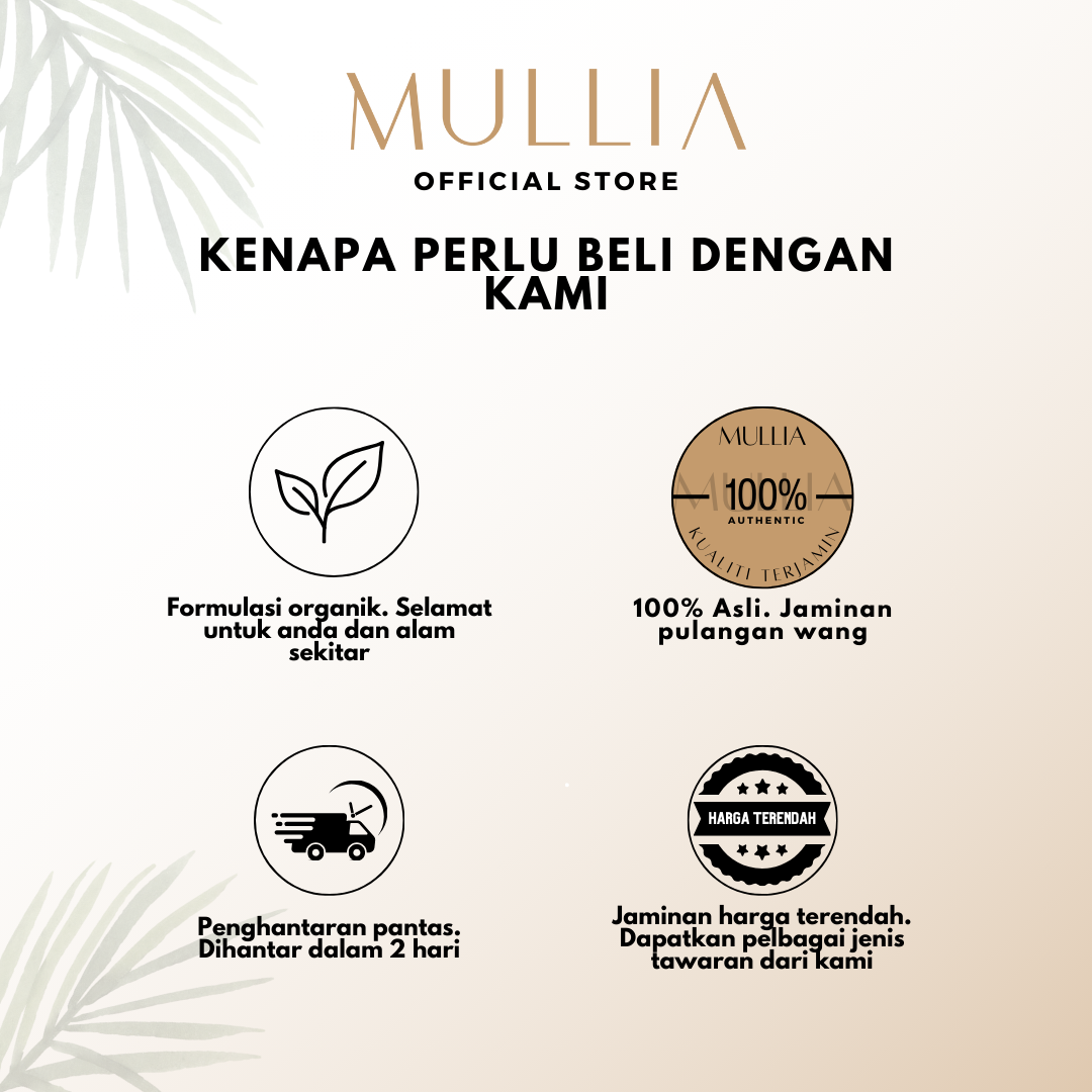 Mullia menjamin keyakinan rutin penjagaan rambut anda dengan bahan organik semulajadi yang bukan sahaja melembutkan rambut anda tetapi juga menjaga kesihatan rambut anda secara menyeluruh. Rasai perbezaan dengan formula bebas paraben dan bebas bau kami yang menyumbang kepada hasil rambut yang menawan. Serlahkan kecantikan anda dari hujung rambut dengan Mullia.